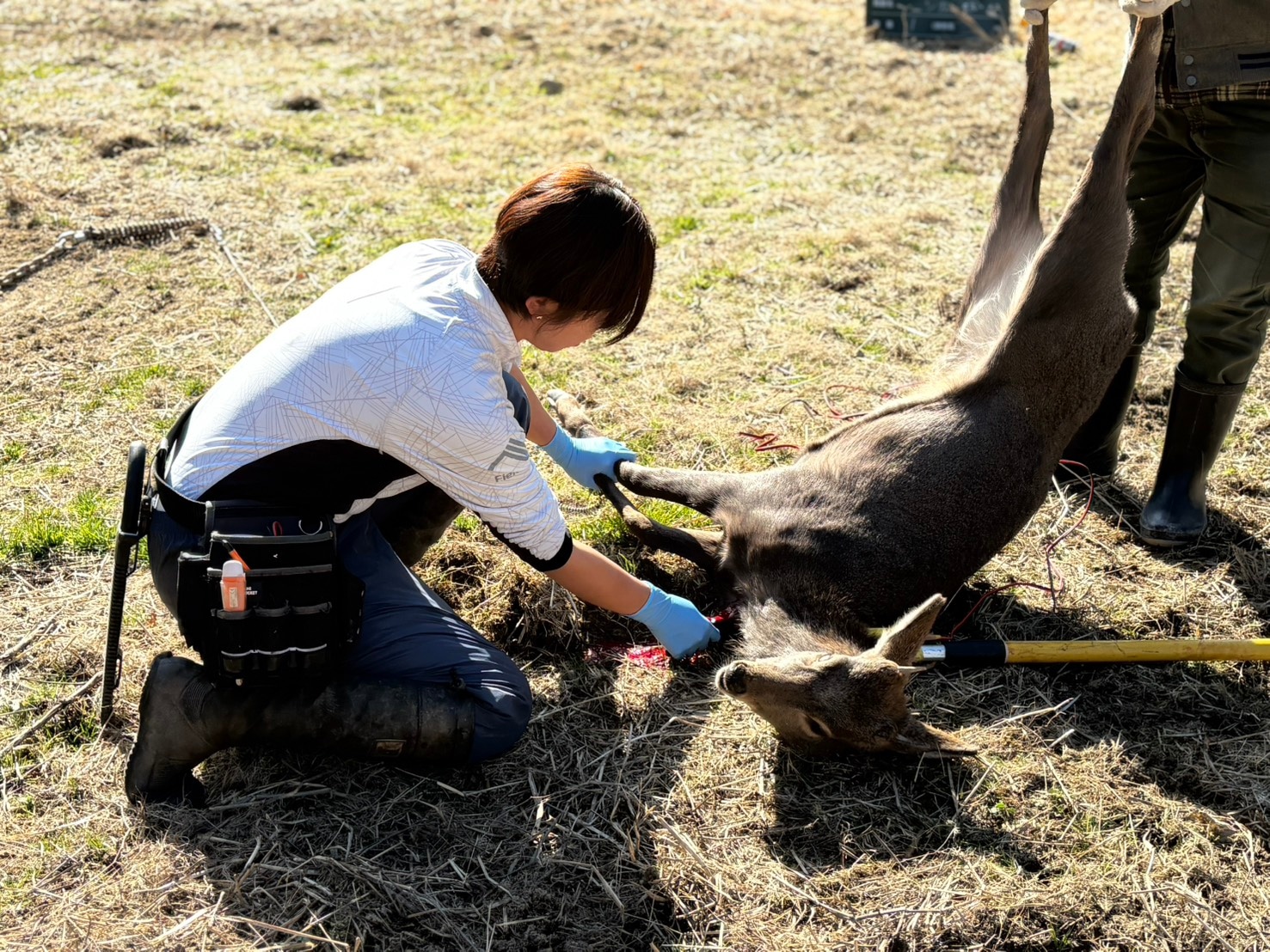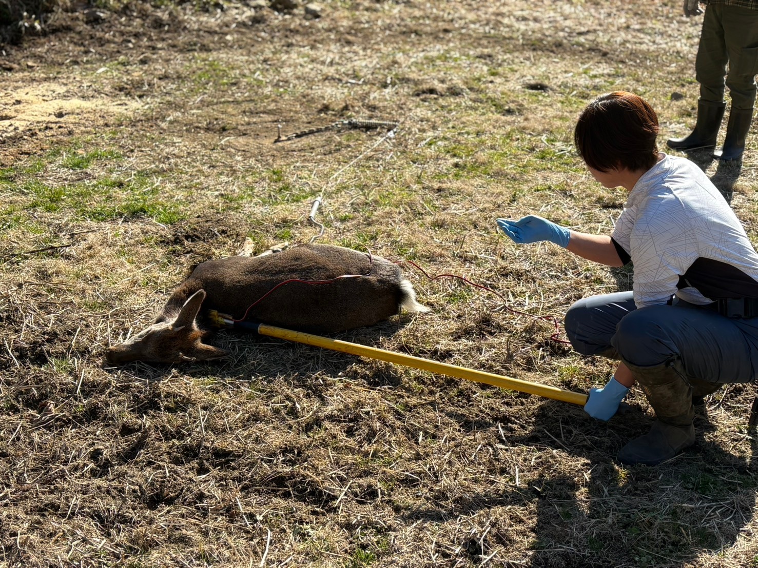その様子を慎重に見極めながら距離を詰め、電気槍を一突き。十分に電気を通し、鹿を確実に気絶させます。