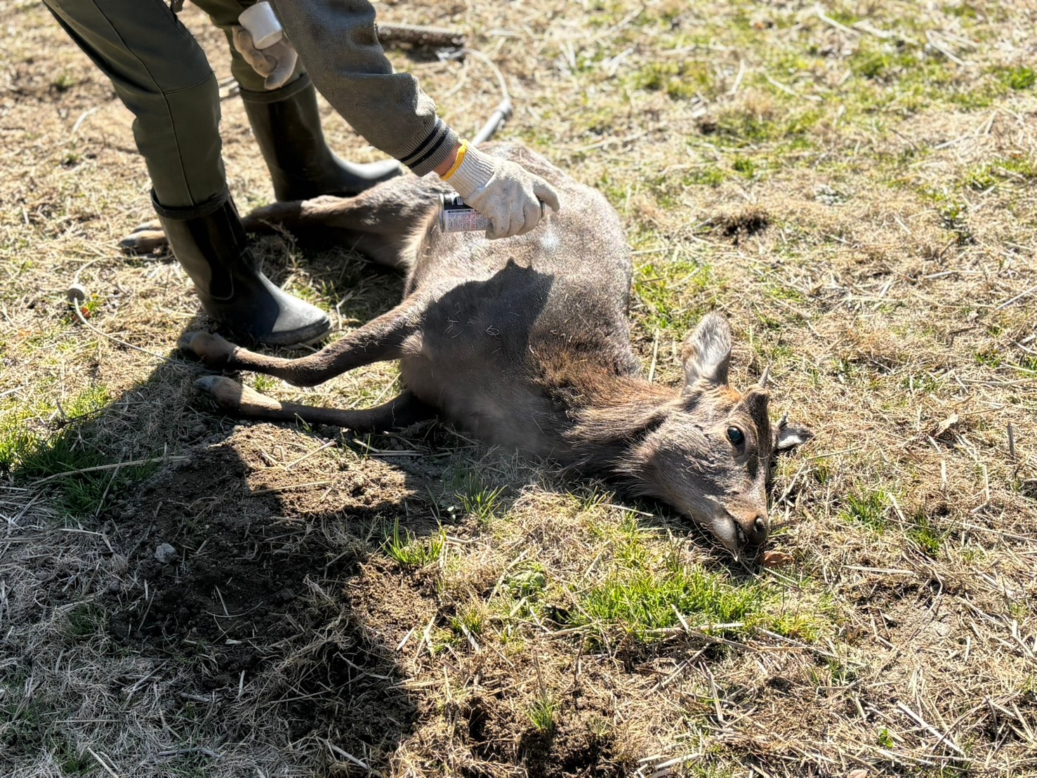 捕殺後は、補助金申請用の記録として、鹿の体にスプレーで日付を書き、写真撮影を行います。