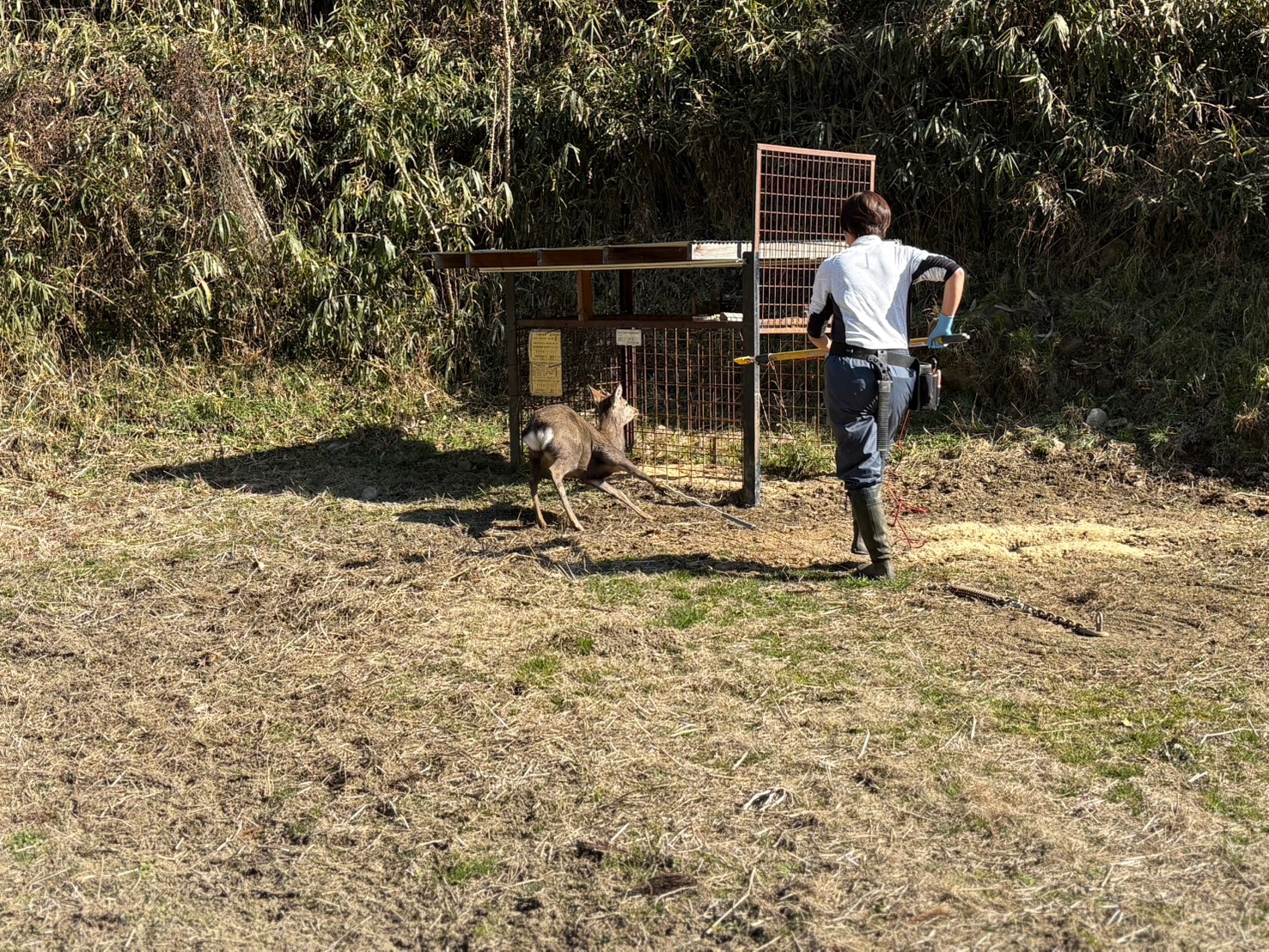 仕組み自体は意外なほど単純ですが、鹿がどの位置で足を運ぶかを想定し、米ぬかの撒き方を変えることで、狙った場所に足を誘導する。さらに、その先には檻罠が設置されており、鹿の行動を段階的にコントロールする構成になっていました。