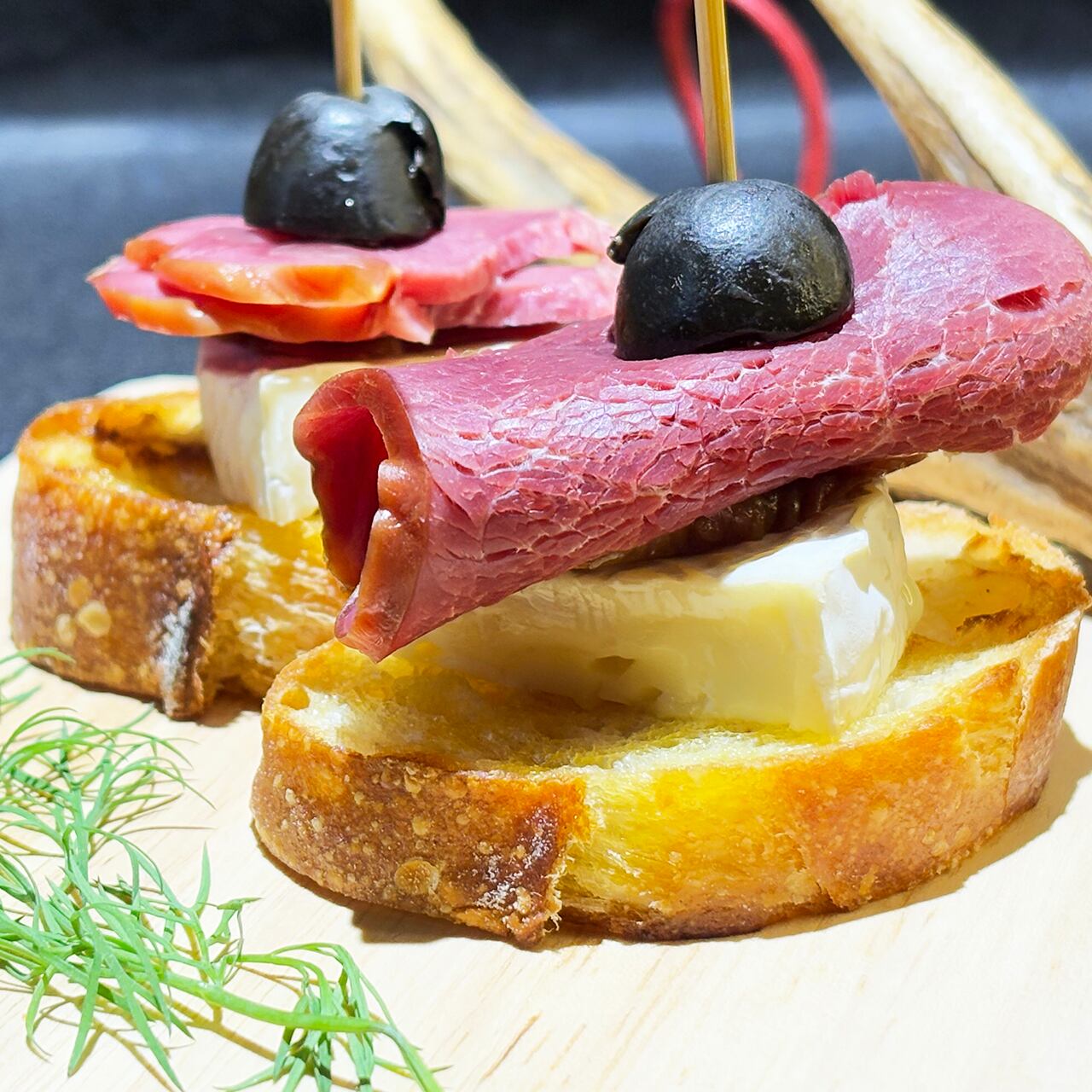 軽く焼いたバゲットにカマンベールチーズと鹿ハム、オリーブをのせました。